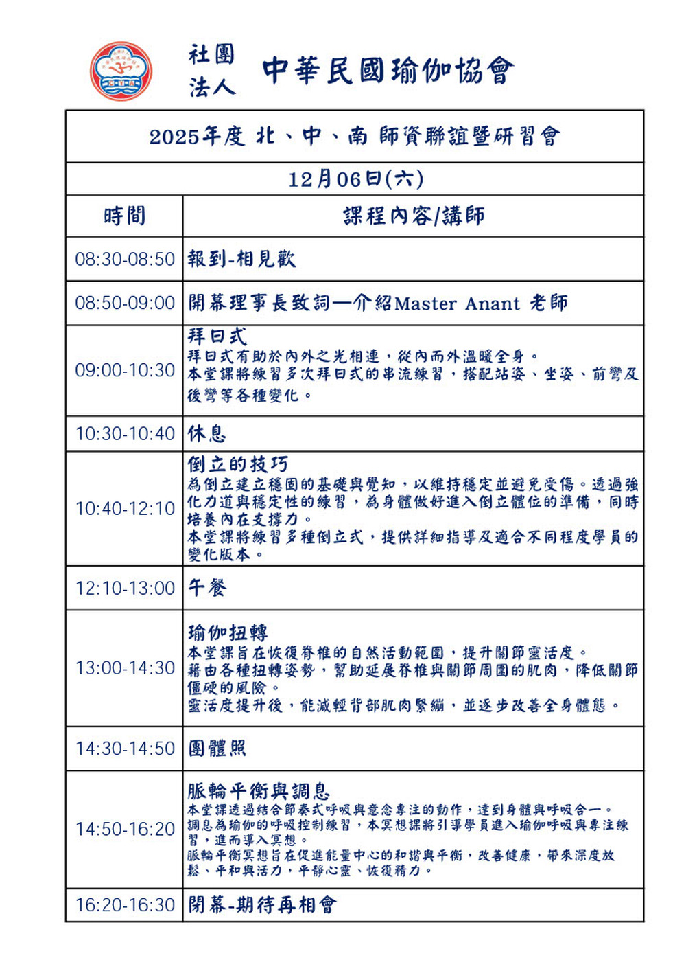 各位親愛的伽人們 非常感謝您参加今天的「師資聯誼」活動。看到來自不同城市、不同教學現場的老師們齊聚台中,我心中充滿感恩。瑜伽讓我們相遇,也讓我們在持續的練習與教學中,更親近自己、更親近彼此。 身為中華民國瑜伽協會理事長,我深深知道,每一位老師在課堂上的用心、在生活中的實踐,都是協會最珍貴的能量。今日的相聚,是希望讓我們彼此交流、彼此支持,也讓瑜伽的精神「連結、覺知、慈悲」更加落實~ 感謝中部會長古雪芳老師及所有協助籌備的團隊與志工 因為你們的默默付出.今天才能如此順利圆滿. 希望今天的相聚.不僅是一埸活動.更是一份續航的力量.願我們帶著今日的滿滿能量.回到您的家及各自的教室.持續點亮更多生命的光茫- 祝福大家 身心安住.教學順利.法喜充滿 3月會員大會台北見~ 謝謝大家(謝謝)Namaste